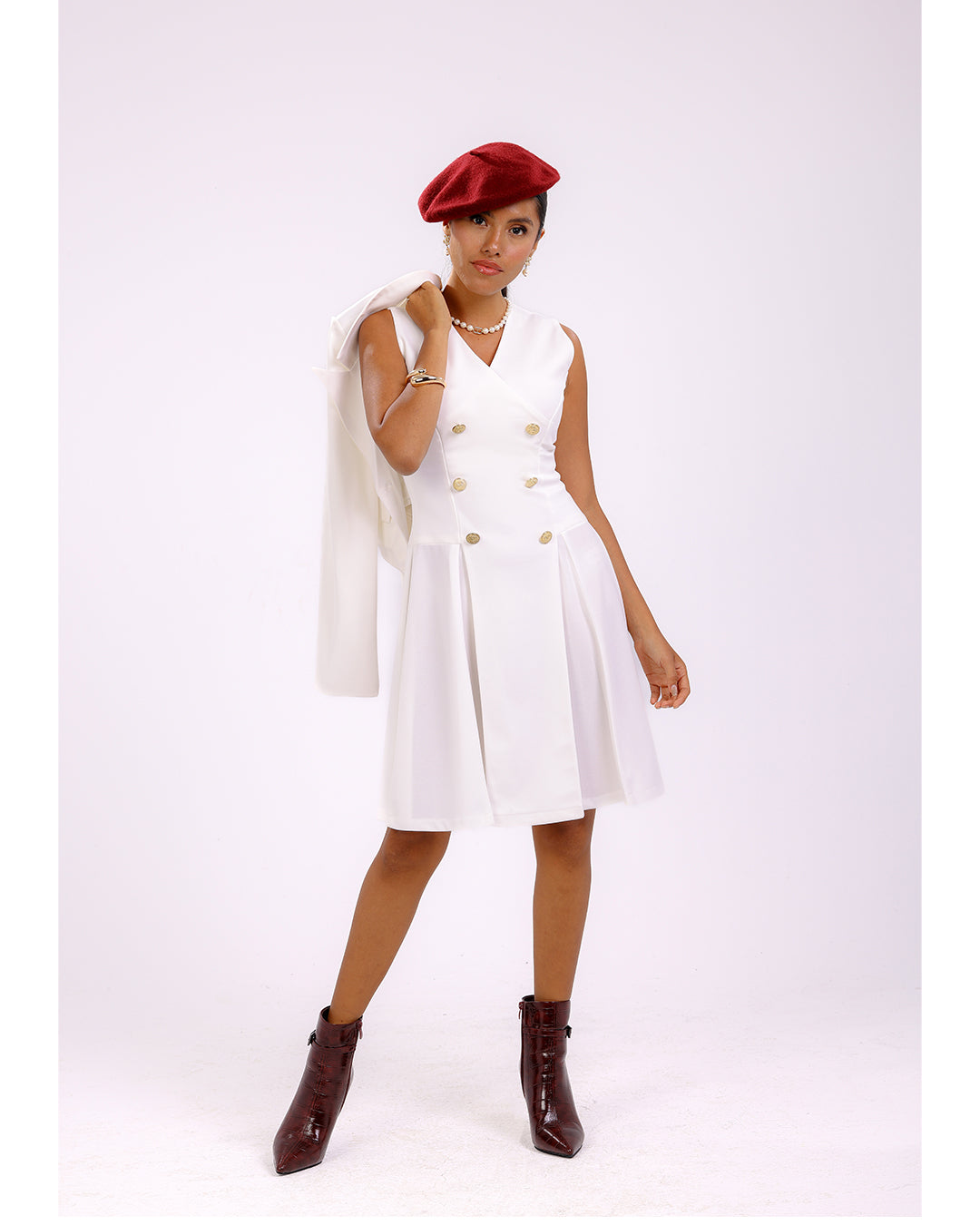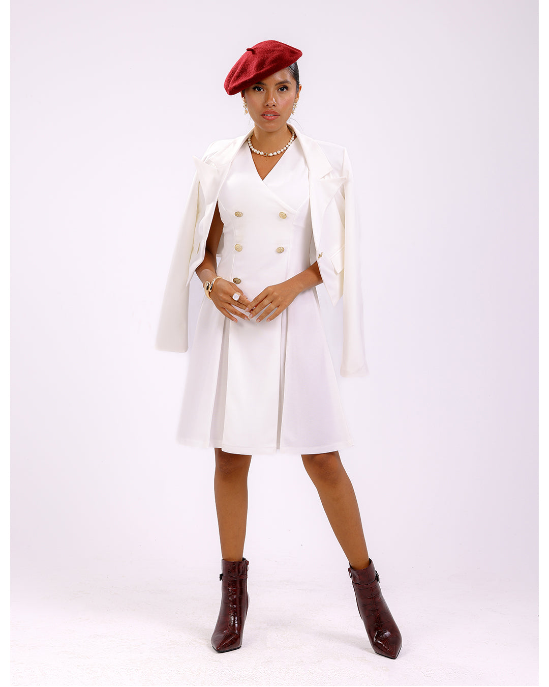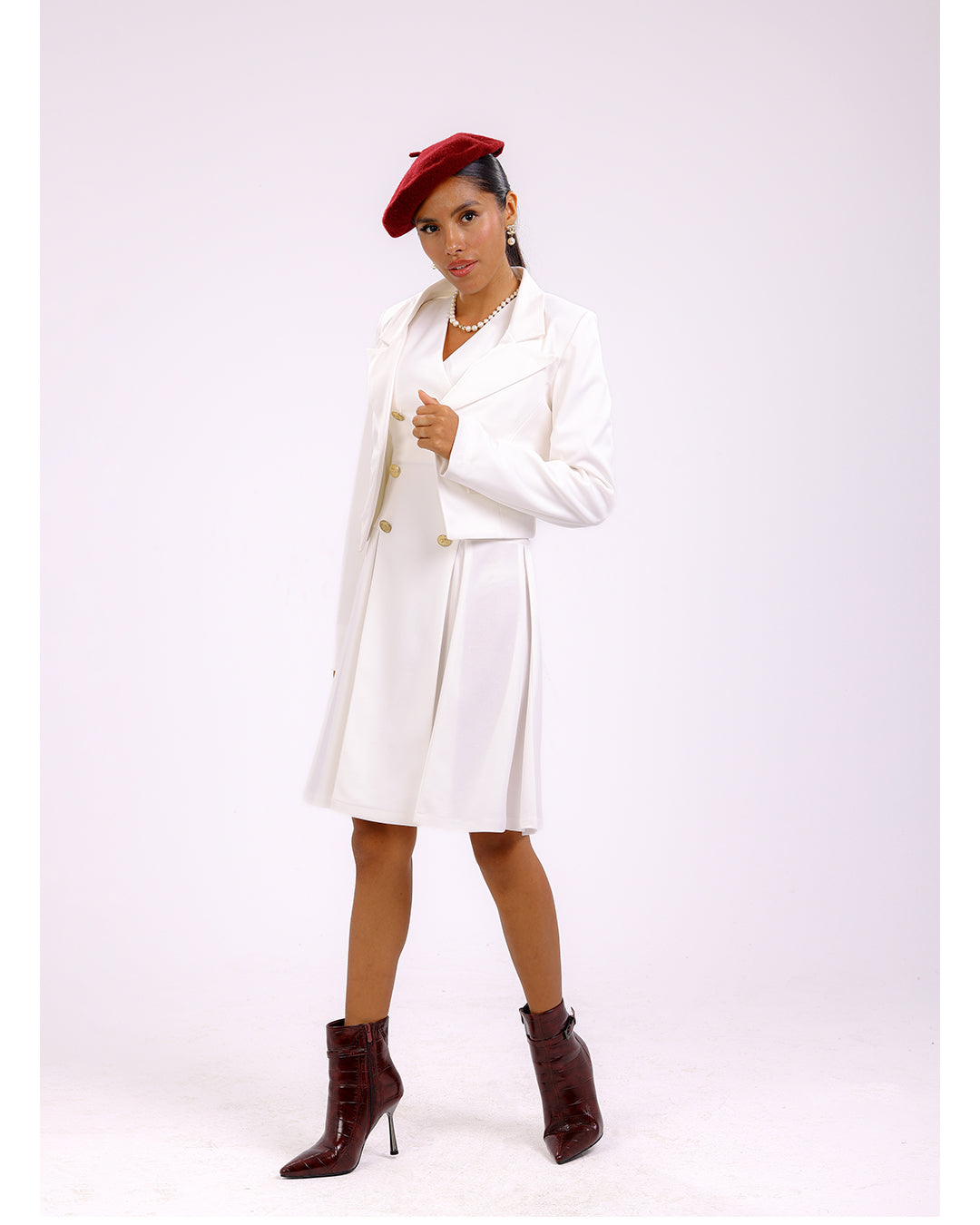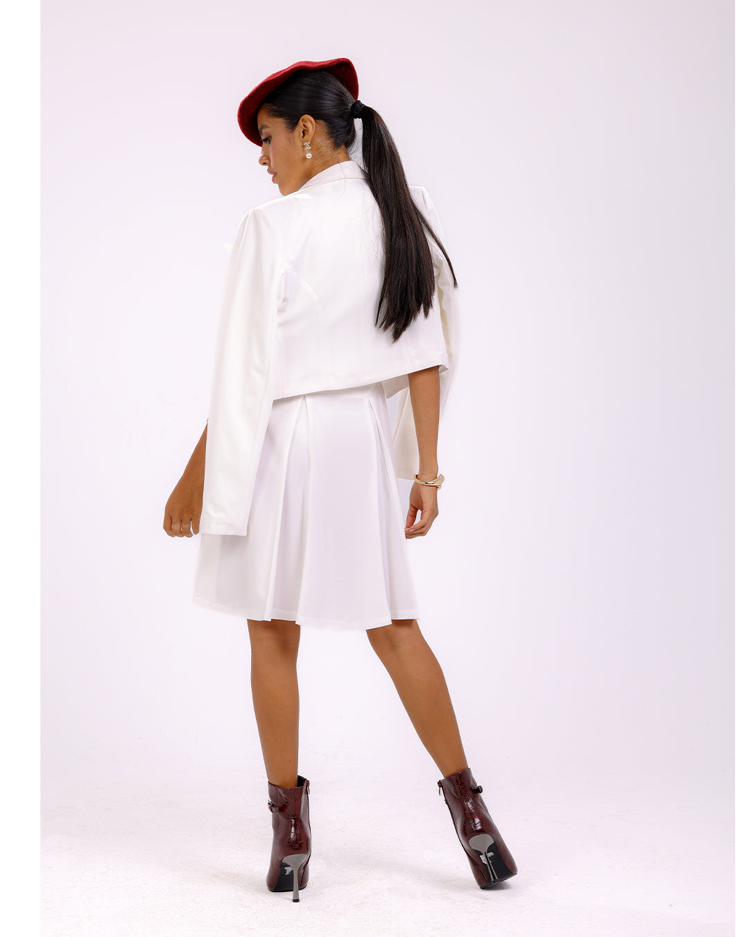 This sophisticated two-piece set delivers maximum impact with minimal effort. It features a fitted, cropped jacket paired with a flowing, pleated mini-dress to create a confident and ultra-chic silhouette.